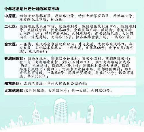 同时,还计划启动30家市场外迁,其中中原区3家、二七区9家、金水区5家、管城回族区10家、郑东新区1家、火车站地区2家。